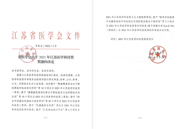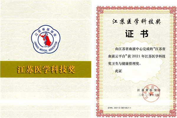 根据《省医学会关于2021年江苏医学科技奖奖励的决定》(苏医会[2022]2号)文件精神,江苏省血液中心课题项目“江苏省血液云平台”被授予2021年江苏医学科技奖卫生与健康管理奖。