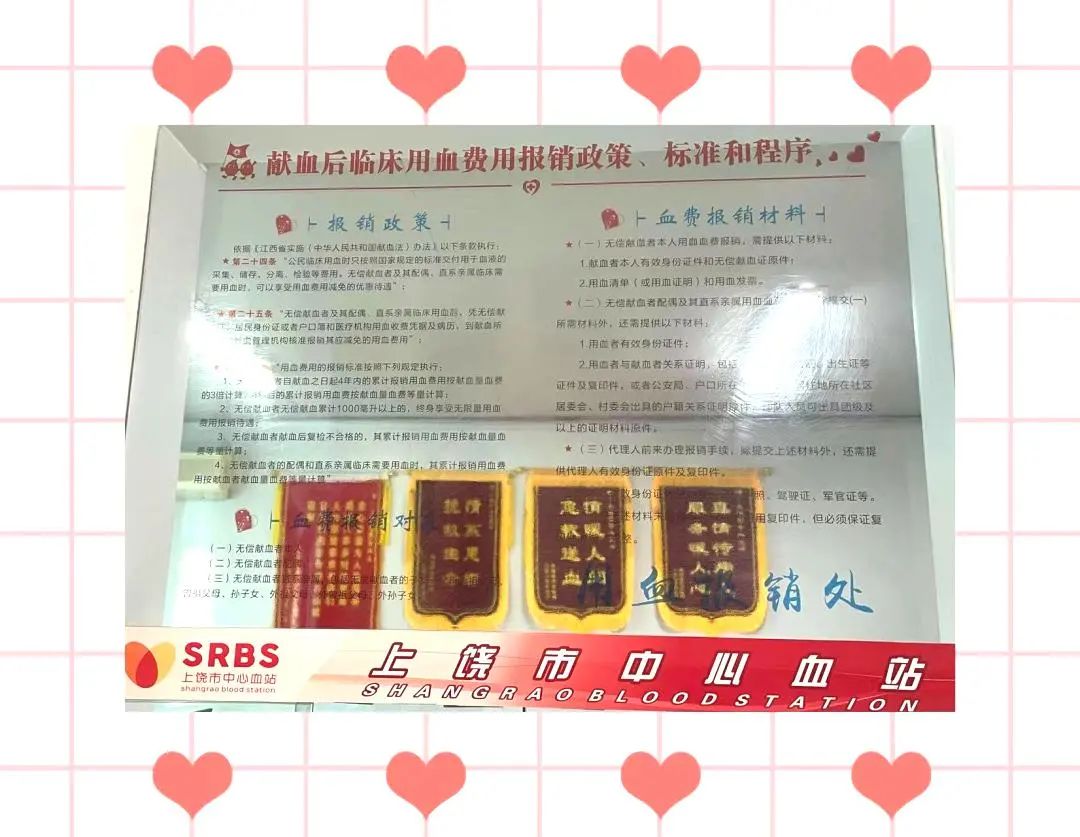 目前,上饶市无偿献血者及其亲属血费报销方式有三种:一是献血者或其亲属,在就诊的医疗机构直接办理血费报销;二是工作日在市中心血站一楼用血报销处进行现场办理;三是在上饶市献过血,如在异地产生用血,可将有关资料邮寄至市中心血站用血报销处。