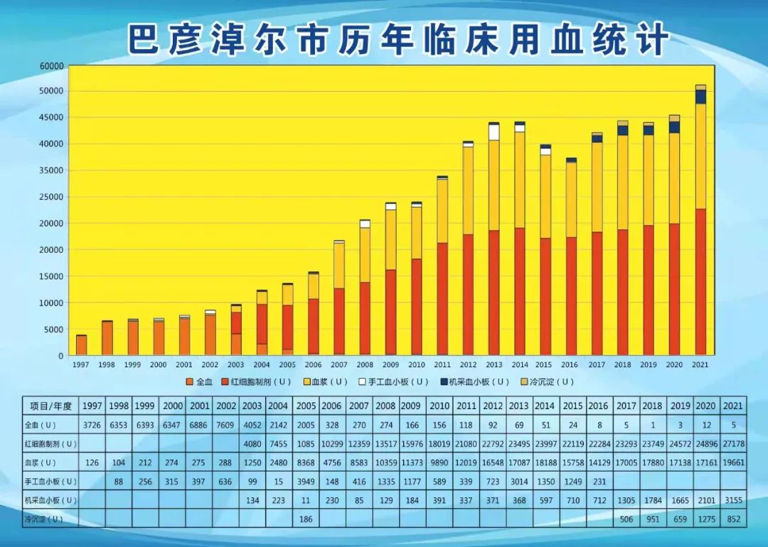 回首我市无偿献血的发展历程,全市各族群众人道、博爱、无私奉献的精神时时闪耀着熠熠光彩。自1998年《中华人民共和国献血法》实施以来,无偿献血人数日益增加,2021年献血19155人次,总计献血量613万毫升,是1998年献血人次的3.4倍,献血量的4.8倍。随着临床输血技术的发展,国家对血液输注安全更加重视,2006年,我站响应国家号召,大力推广成分输血,引进了血小板采集设备,当年全市捐献单采血小板17人次,总计18个治疗量,到2021年我市捐献单采血小板1671人次,总计3161个治疗量,捐献量增加了174.6倍;从1998年至2021年,我市的献血量以年平均3%的增长率逐年攀升,在献血量增加的同时,我站也加大了对血液质量和安全的监管,截止目前,全市没有出现过一次缺血事件、没有发生过一起差错事故、没有出现过一例经血传播疾病,挽救了无数个患者的生命。这一亮眼的成绩,完美诠释了“敬佑生命,救死扶伤,甘于奉献,大爱无疆”的博爱精神,成为鼓舞我们每一位无偿献血者的精神追求和人生信仰,护佑着广大患者的健康和生命安全。