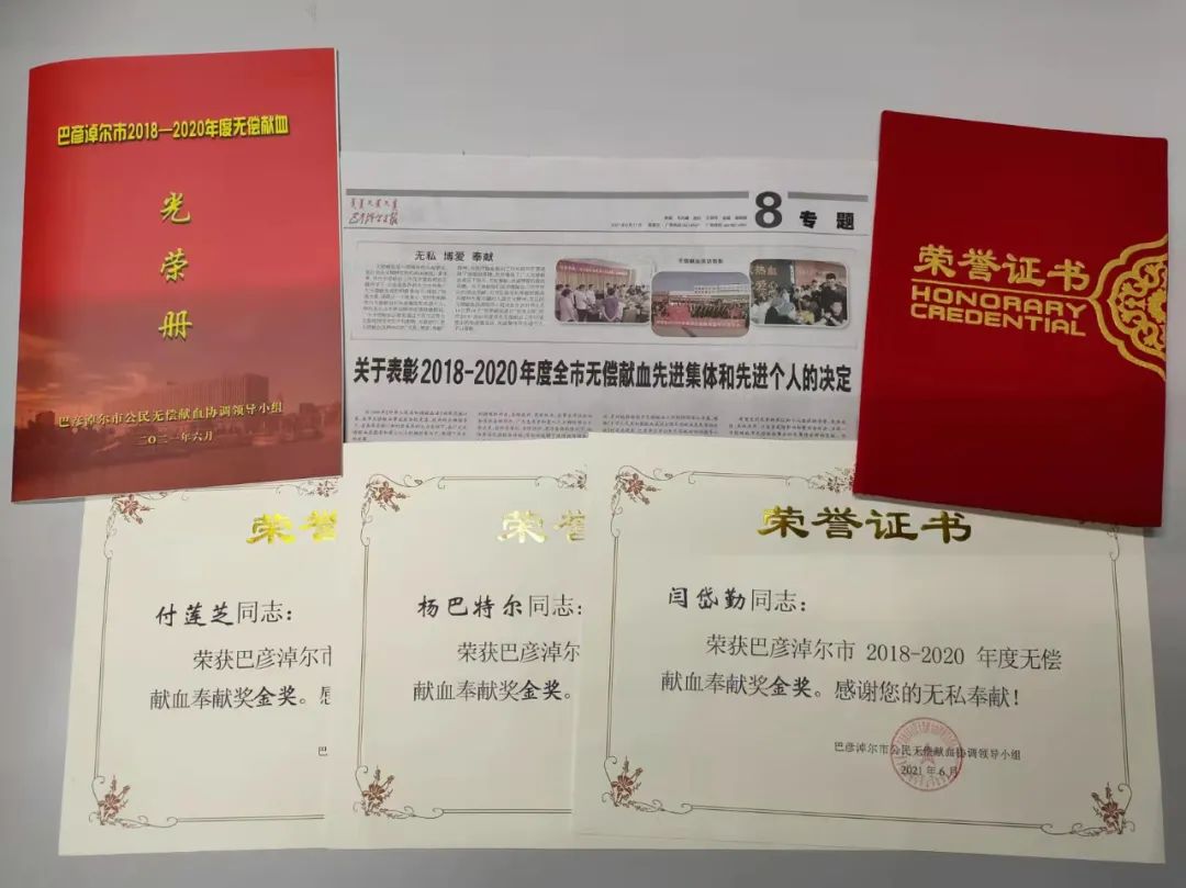 岁月静好,是因为有人在默默地付出。每一位无偿献血者都为素昧平生的患者奉献过自己的爱心,他们用自己的热血,托起了一位位用血患者的生命希望,没有人生来就是英雄,总有人用平凡成就伟大,为了感谢这些英雄,表达我们的敬意,我市在“6·14世界献血日”对2018-2020年度无偿献血先进旗县、先进集体、促进奖和奉献奖予以了表彰,为他们颁发了证书和奖杯,感谢他们多年来为推动我市无偿献血事业的整体发展作出的辛苦努力和无私奉献。