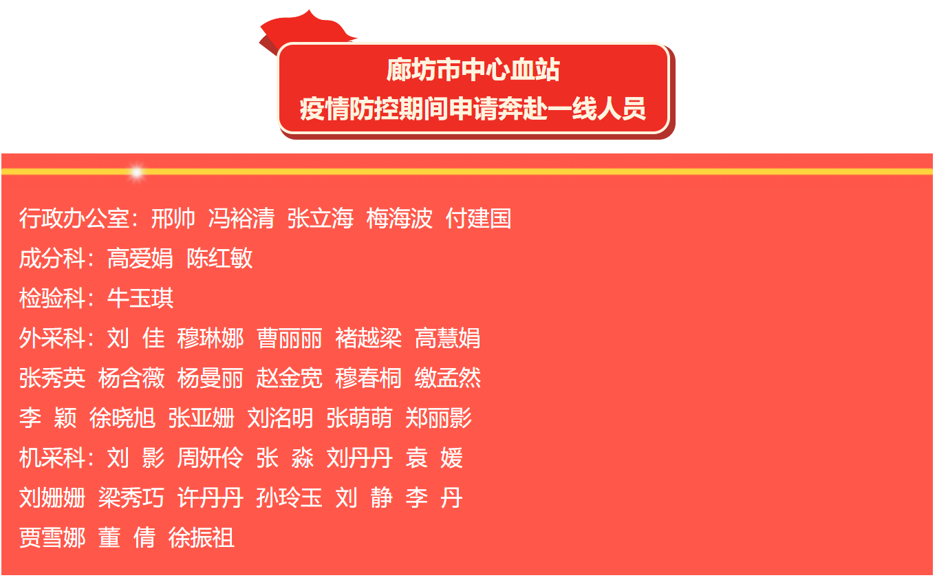 疫情面前担使命,越是艰难越向前。廊坊市中心血站党员干部带头响应组织号召、带头参与防控工作、带头遵守防控规定、带头坚守工作岗位,充分发挥党员先锋模范作用,在疫情防控工作中践行初心和使命、体现责任与担当。
