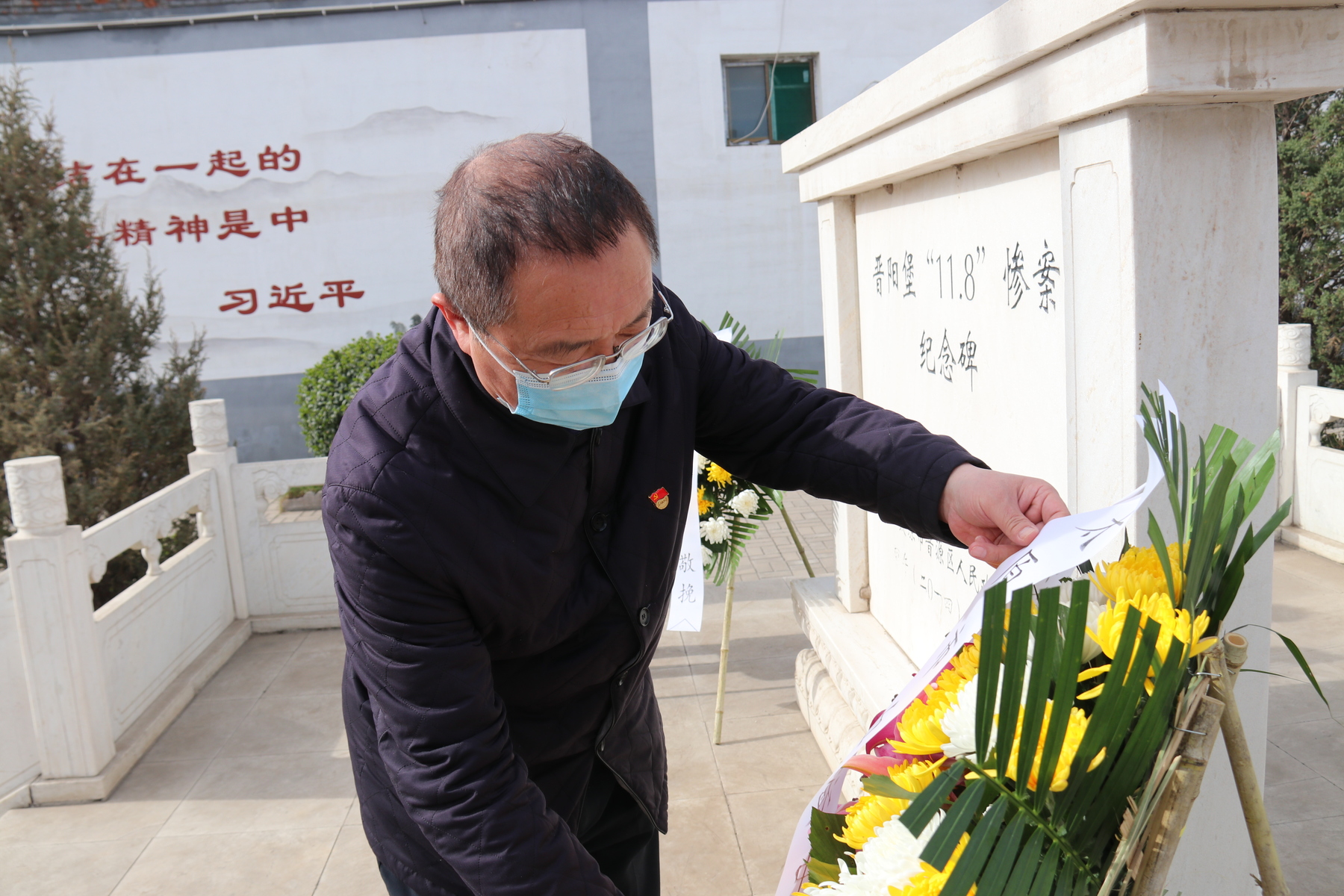 活动第一项,在庄严肃穆的晋阳堡“11·8”惨案纪念碑前,全体人员默哀三分钟。第二项,向纪念碑敬献花圈,中心党委书记、主任白林整理挽联。第三项,全体人员依次向纪念碑敬献鲜花。第四项,在中心党委书记、主任白林的带领下全体人员面对鲜红的党旗和肃穆的纪念碑重温入党誓词。第五项,中心党委书记、主任白林进行讲话,他要求全体党员干部职工要向三晋大地上众多英雄儿女们学习,学习他们不畏艰难、勇于献身的革命精神,鼓舞斗志;学习他们为新中国的成立前赴后继、不怕牺牲的进取精神,坚定信心;学习他们为了实现广大人民的根本利益不求索取、时刻为民的奉献精神,一心为民。以他们的精神为动力,将血液中心高质量发展与持续巩固拓展党史学习教育成果结合起来,与认真贯彻落实习近平总书记考察调研山西重要指示精神结合起来,与实现市卫健委“144585”宏伟愿景结合起来,进一步转变工作作风,以踏石留印、抓铁有痕的干事创业劲头,踔厉奋发,笃行不怠,以优异成绩,告慰先烈们的英灵!