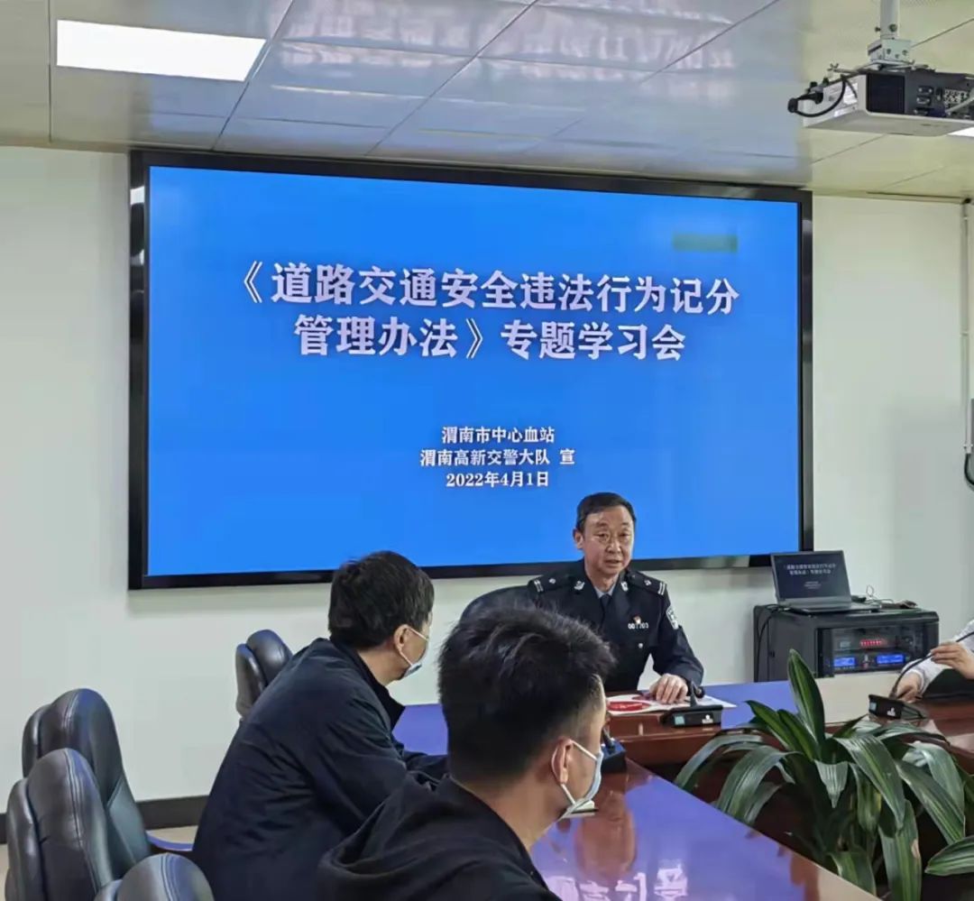 为提高驾驶员遵守交通法规安全意识,切实维护血站安全生产的持续稳定健康发展,4月1日上午,渭南市中心血站邀请高新交警大队副大队长刘全红、交通秩序管理中队中队长徐岗峰、法宣中队中队长石军为血站车辆安全员及驾驶员讲解了新颁发的《道路交通安全违法行为记分管理办法》(公安部令第163号)以及交通安全知识。