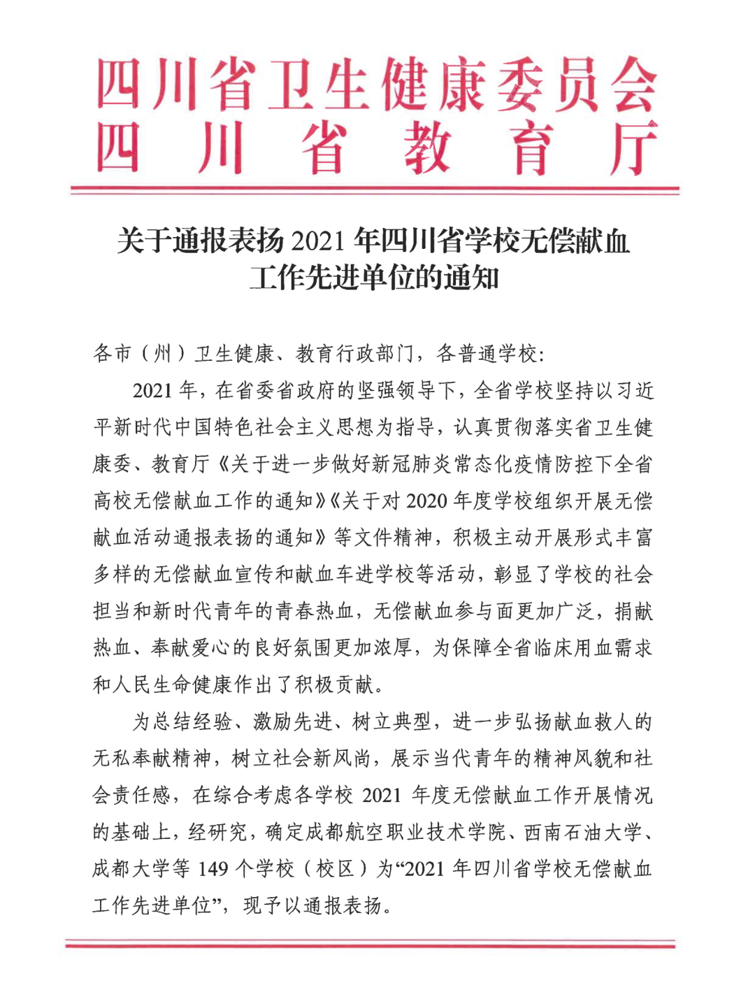 3月28日,四川省卫生健康委员会、四川省教育厅联合印发《关于通报表扬2021年四川省学校无偿献血工作先进单位的通知》,通报表扬149个学校(校区)为“2021年四川省学校无偿献血工作先进单位”,其中广元共7所学校荣获通报表扬。