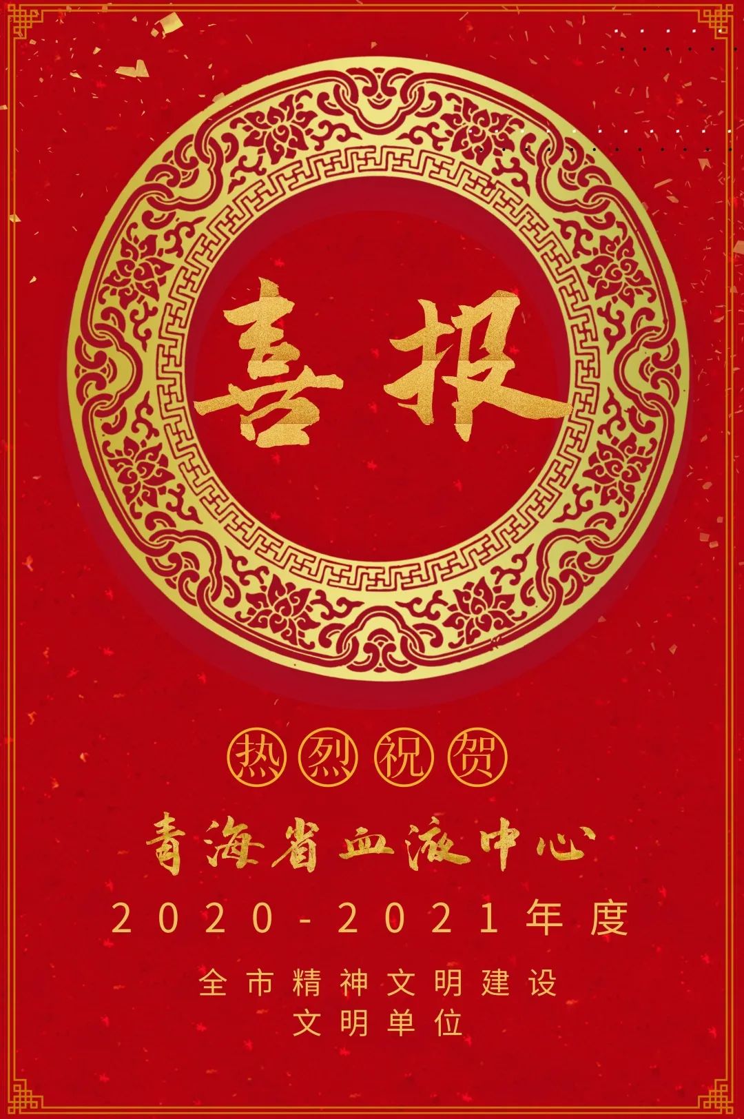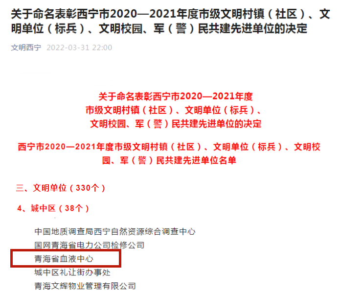 2022年3月31日,西宁市文明办公布了《关于命名表彰西宁市2020—2021年度市级文明村镇(社区)、文明单位(标兵)、文明 校园、军(警)民共建先进单位的决定》;其中,青海省血液中心荣获“全市精神文明建设文明单位”的称号!喜报传来,极大地鼓舞了中心全体职工的信心。