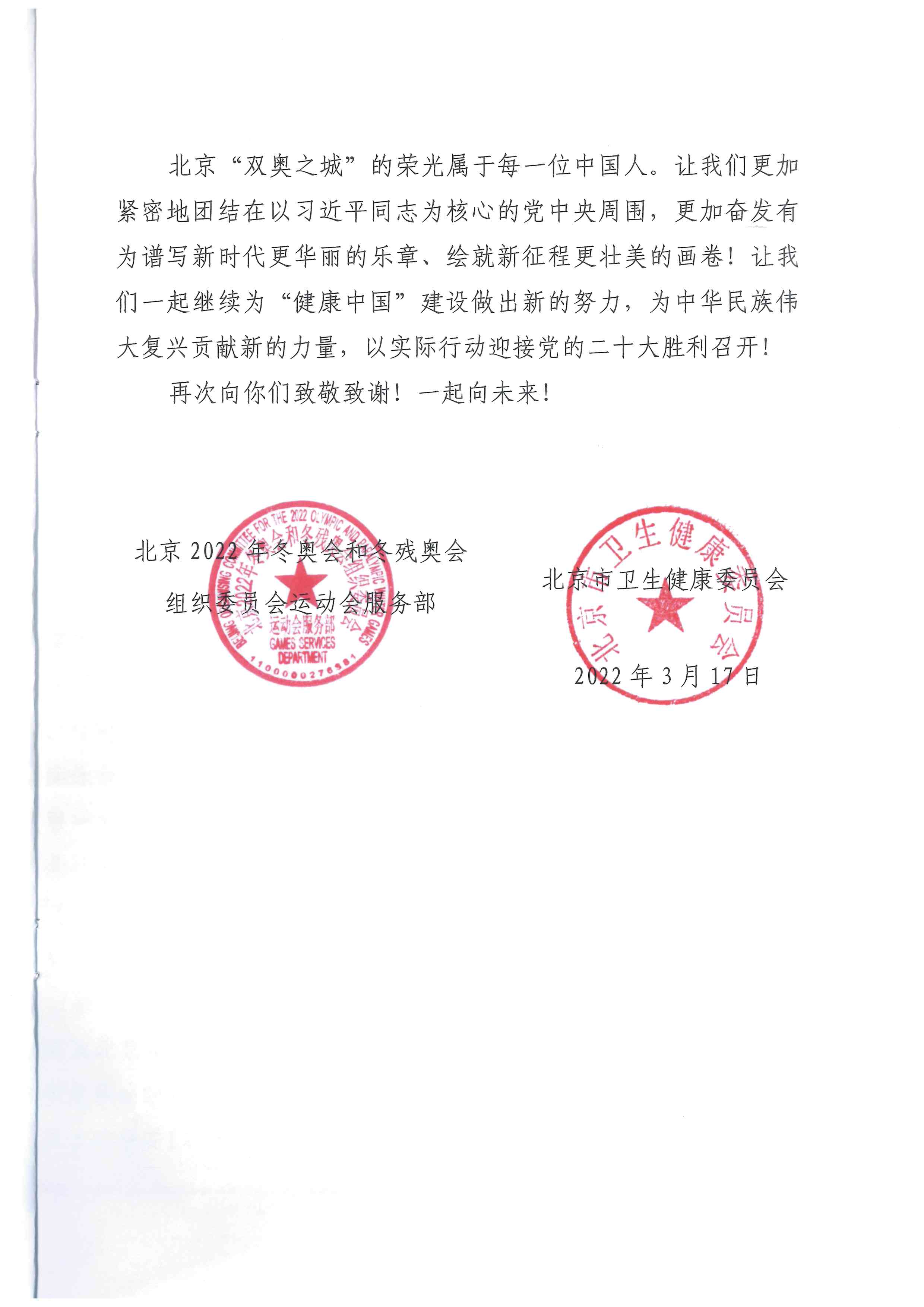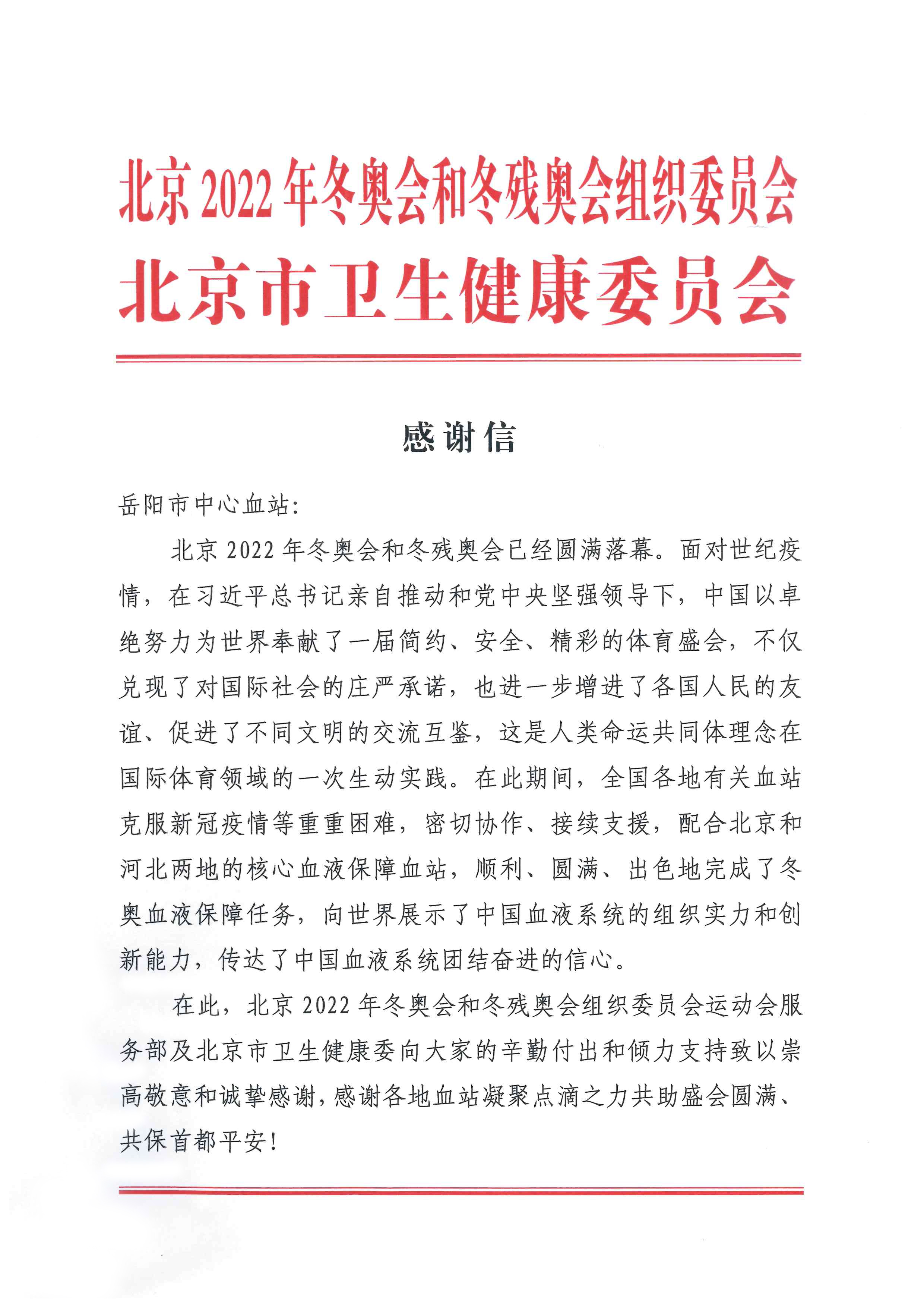 近日,北京2022年冬奥会和冬残奥会组织委员会、北京市卫生健康委员会联合向岳阳市中心血站发来专题感谢信。信中向岳阳市中心血站克服疫情等困难影响,支援北京,出色完成冬奥血液保障任务,凝聚点滴之力共助盛会圆满、共保首都平安致以崇高敬意和诚挚感谢!