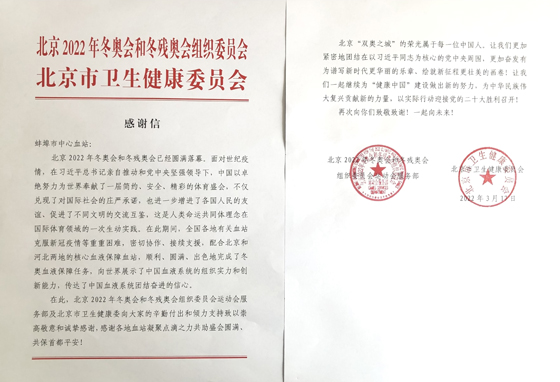 北京“双奥之城”的光荣属于我们每一位中国人。奥运会是世界盛会,是人类命运共同体理念在国际体育领域的一次生动实践,作为盛事参与者,蚌埠市中心血站和广大爱心市民深感光荣。对于我站全体采供血工作者而言,这封感谢信既是鼓励又是鞭策,既是认可又是动力。