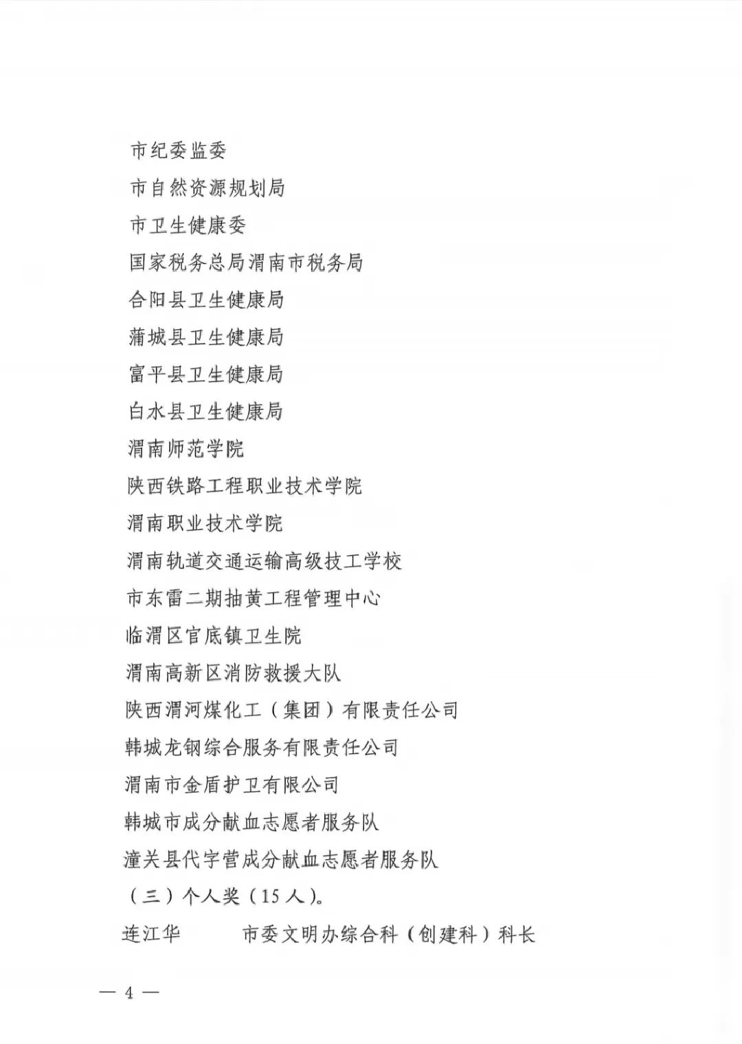 4月2日,渭南市人民政府办公室印发了《关于表彰2021年度全市无偿献血先进单位和先进个人的通报》,对2021年度在无偿献血工作中表现优异、成绩突出的韩城市等5个县市区、市委文明办等27个单位、连江华等25名同志予以表彰。