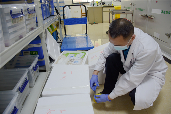工作人员正在清点血液袋数,准备装箱