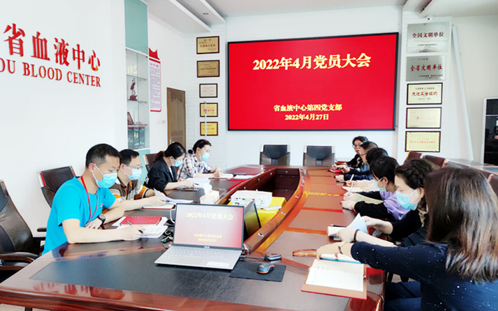 2022年4月27日,贵州省血液中心第四党支部召开4月党员大会,组织支部党员专题传达学习贯彻习近平总书记在海南考察时的重要讲话精神。