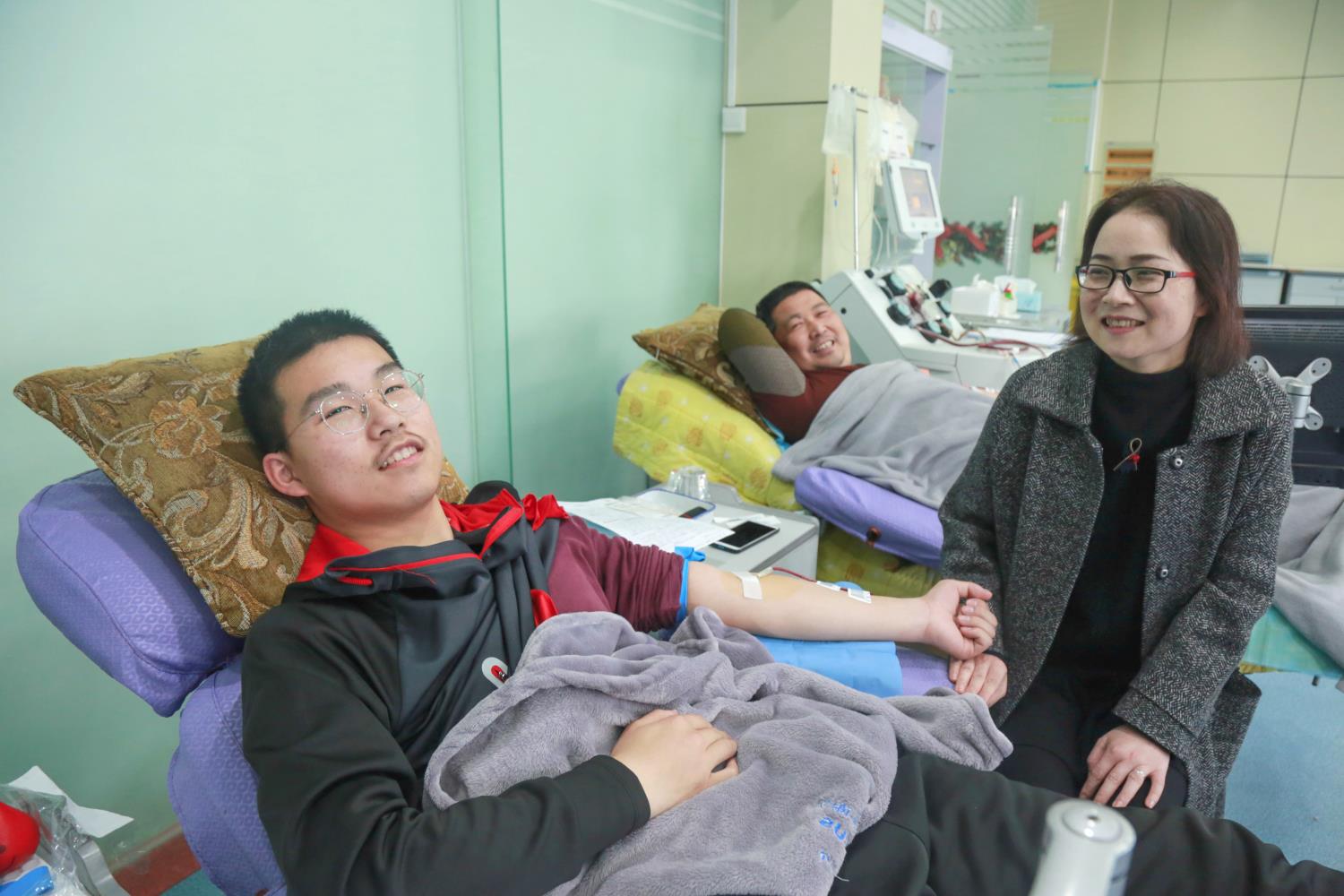 这位少年名叫鲁立诚,是孝感市红十字无偿献血志愿服务队队长鲁锋的儿子。当天,是他18岁生日。中午12点,鲁立诚刚刚放学,就和父母一起按照事先的约定,来到市中心血站。在经过献血前体检和筛查之后,他和父亲鲁锋一起挽袖,分别捐献2个治疗量单采血小板和300毫升全血。