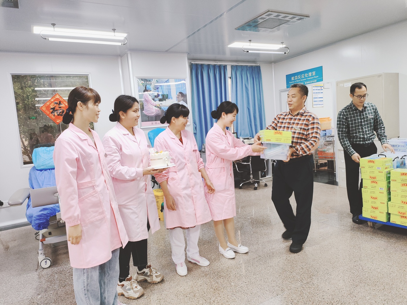 2022年5月12日,中心主任韦少俊、副主任梁汉武和韦军到一线科室对坚守在岗的护士同胞们表示了节日的问候。同时,也对一直以来坚守在采供血及疫情防控一线的全体工作人员表达了感谢。副主任梁汉武用献血献爱心来庆祝护士节。