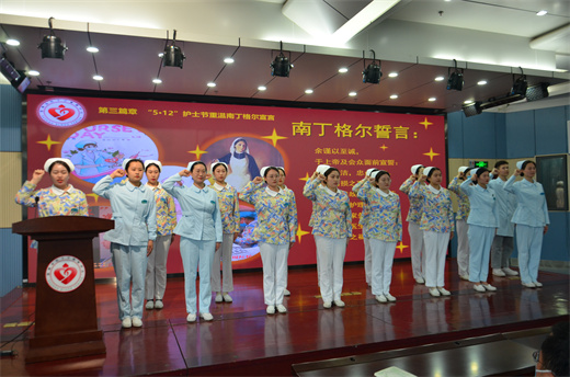 “终身纯洁,忠贞职守。勿为有损之事,尽力提高护理之标准……”,面对南丁格尔誓言,护理人员代表们右手握拳,再次重温誓言内容,承诺以自身行动倡导和弘扬"敬佑生命,救死扶伤,甘于奉献,大爱无疆"的职业精神。