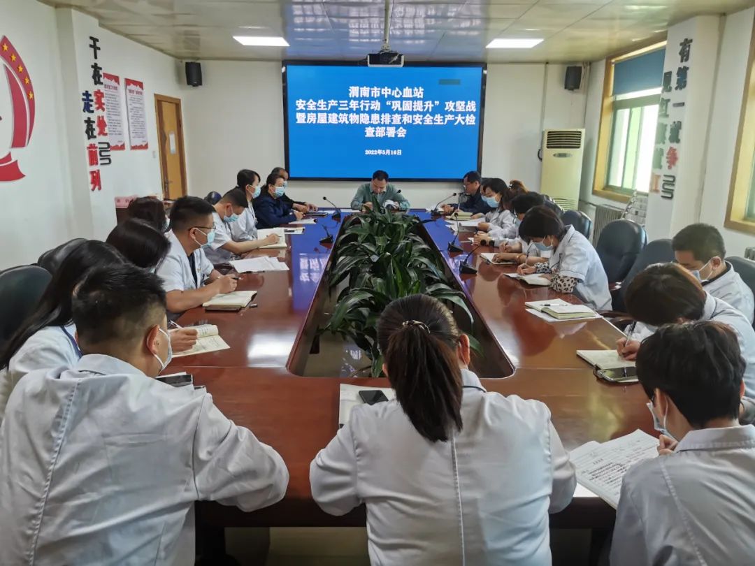 5月16日,渭南市中心血站召开安全生产三年行动“巩固提升”攻坚战暨房屋建筑物隐患排查和安全生产大检查部署会。站领导班子及各科科室负责人参加会议,会议由站党总支书记、站长严胜利主持。