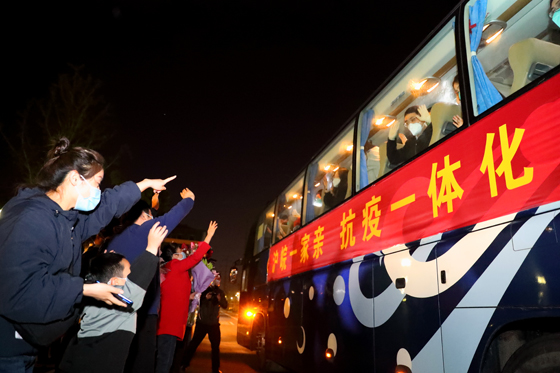 5月13日,在圆满完成援沪抗疫任务后,徐静与同一小组的其他队员一道登上返程大巴,这批队员在上海连续奋战40余天,累计完成样本核酸检测量6万余管。