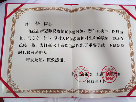 中共上海市委、上海市人民政府授予徐静荣誉证书。在中共上海市经济和信息化工作委员会、上海市经济和信息化委员会的感谢信中写到“厚谊常存,深恩永志。上海不会忘记您临危受命、火速驰援,舍小家为大家的博大情怀;不会忘记您勇往直前、夜以继日,全力以赴检出的最快速度;不会忘记您直面风险、超越自我,为这座城市付出的最大诚意。”
