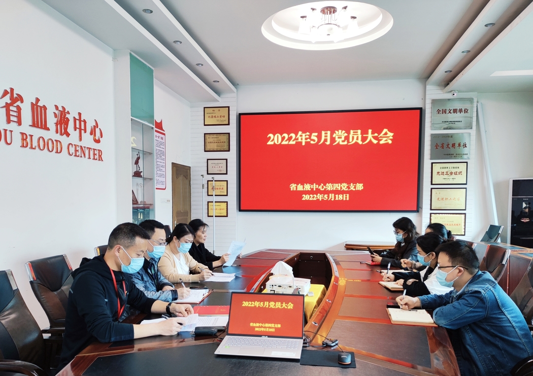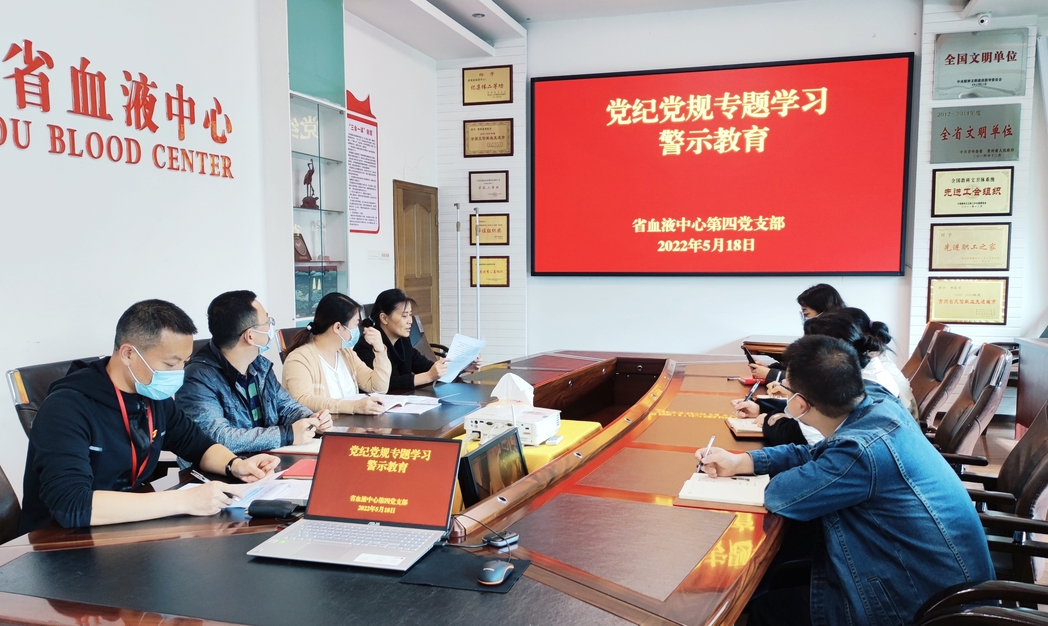 2022年5月18日,贵州省血液中心第四党支部召开会议,组织支部党员专题学习党纪党规,开展警示教育。
