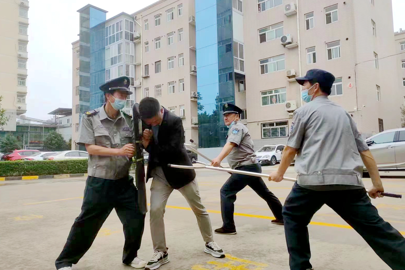 演练模拟一名“不法分子”持械威胁保安人员并意图攻击站内工作人员,在岗保安迅速反应,一方面立即报警,另一方面组织人员使用盾牌、钢叉将“不法分子”向外逼退,并将“不法分子”成功制服。