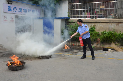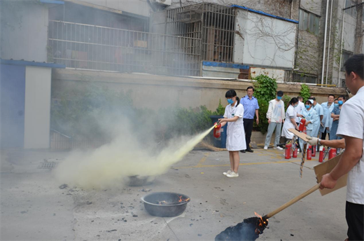 培训完毕后,进行了实地演练。各楼层火灾报警装置同时发出警报,消防控制室发现火情后,利用广播系统通知各楼层人员进行疏散,全体人员通过安全通道进行有序撤离,并在救援现场演练使用手提式干粉灭火器和二氧化碳灭火器为油盆灭火。