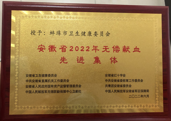 蚌埠市卫生健康委员会荣获安徽省2022年度无偿献血先进集体奖,孙达荣获安徽省2022年无偿献血公益之星奖,安徽科技学院学生徐其妹、蚌埠学院学生黄欢荣获安徽省2022年高校学生无偿献血先进个人奖。