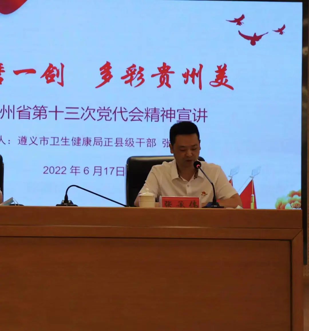 6月17日,按照遵义市卫生健康局党委的统一安排,市卫生健康局正县级干部张晓兵到中心血站开展省第十三次党代会精神专题宣讲。市医疗紧急救援中心主任赵平、市中心血站在家班子成员和双方单位党员及干部职工代表等参加宣讲会。会议由市中心血站副站长(主持工作)张承伟主持。