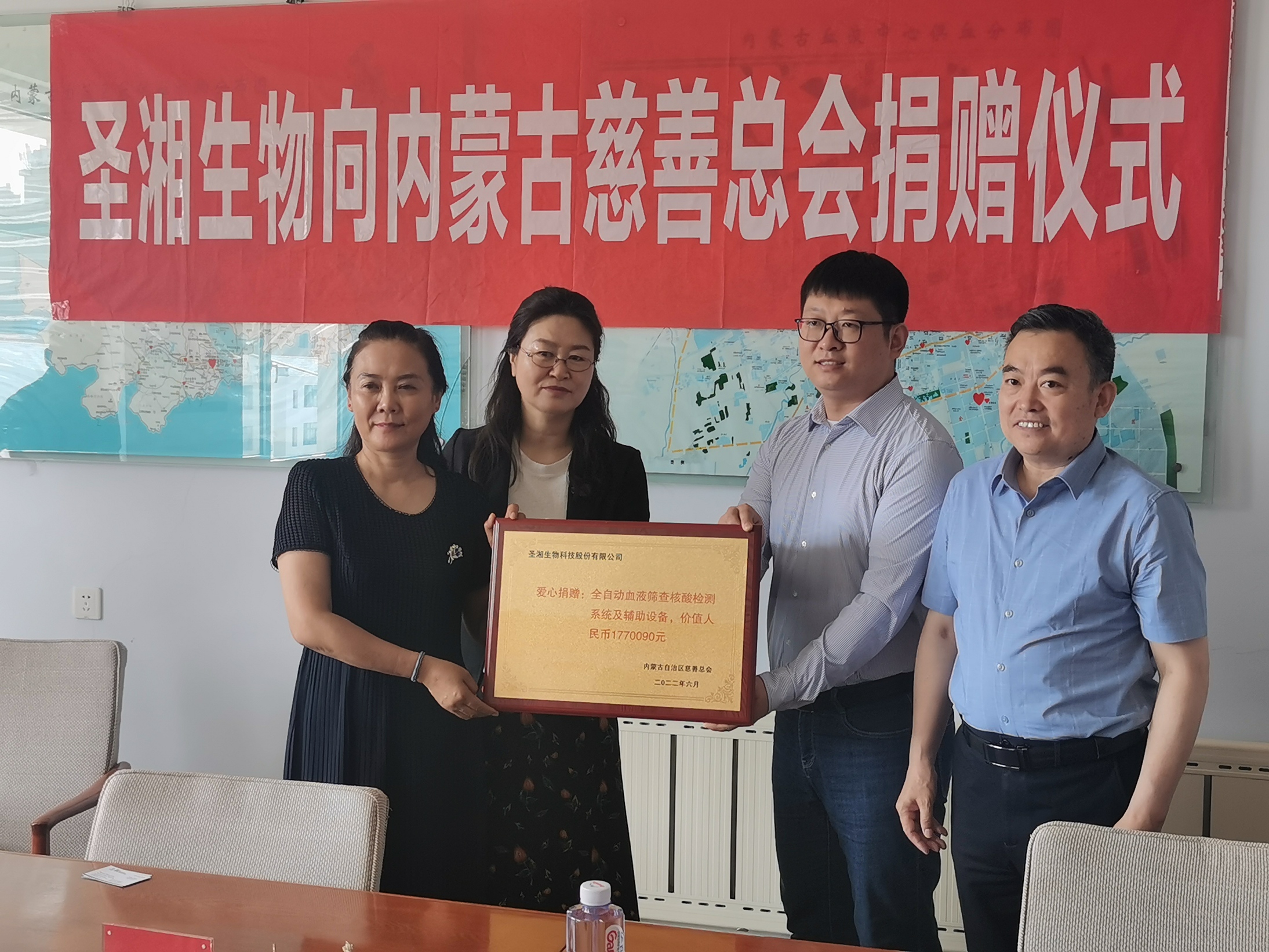 6月17日上午,内蒙古自治区慈善总会联合圣湘生物科技股份有限公司,向内蒙古自治区血液中心捐赠一套全自动血液筛查核酸检测系统及相关辅助设备捐赠仪式在血液中心举行。