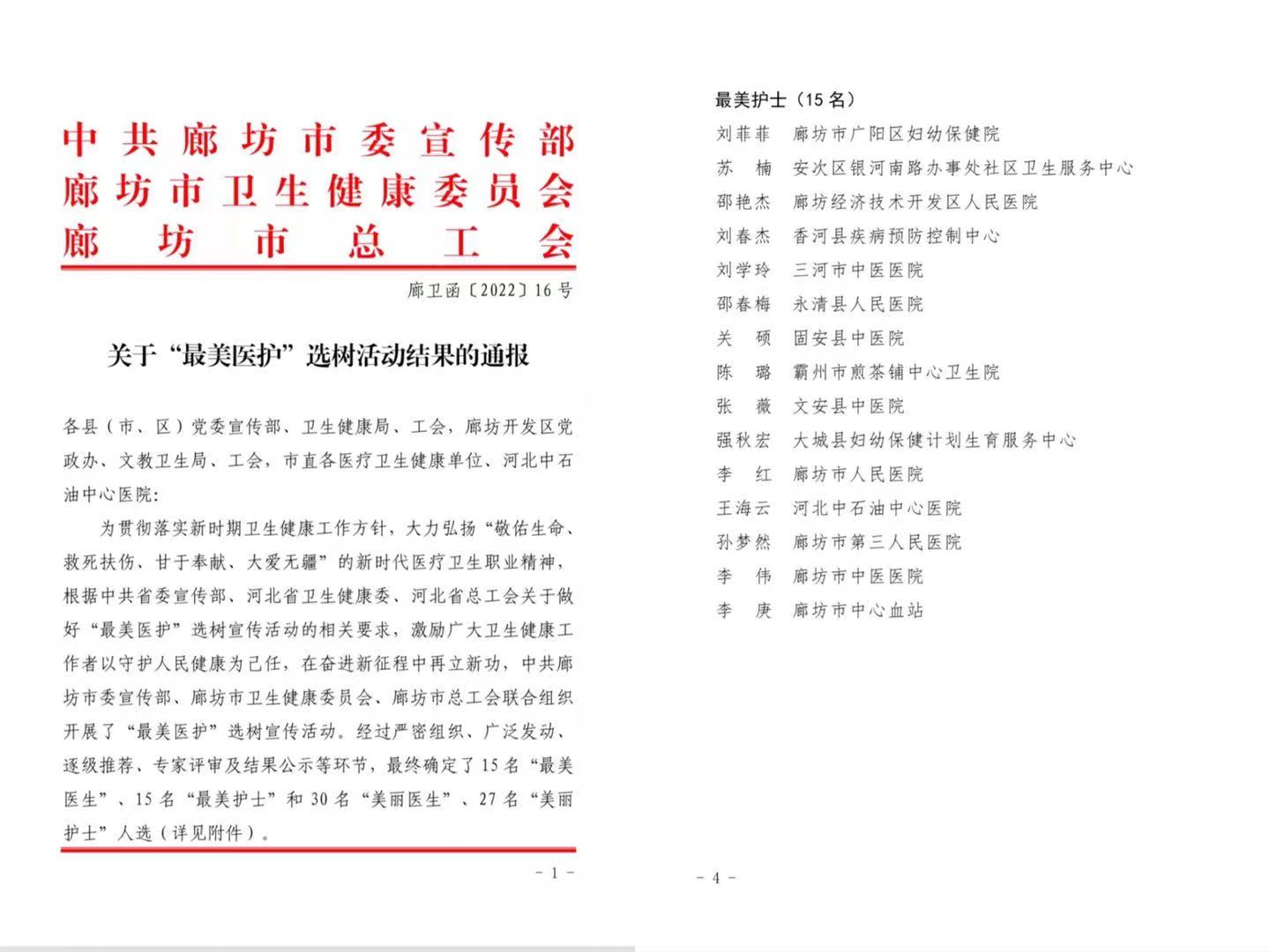 为全方位展现廊坊医务工作者守初心、担使命的时代风采,大力弘扬“敬佑生命、救死扶伤、敢于奉献、大爱无疆”的医疗卫生职业精神,近日,由廊坊市委宣传部、市总工会、市卫生健康委联合组织开展“最美医护”选树宣传活动落下帷幕,廊坊市中心血站护士李庚被评为2022年“最美护士”。