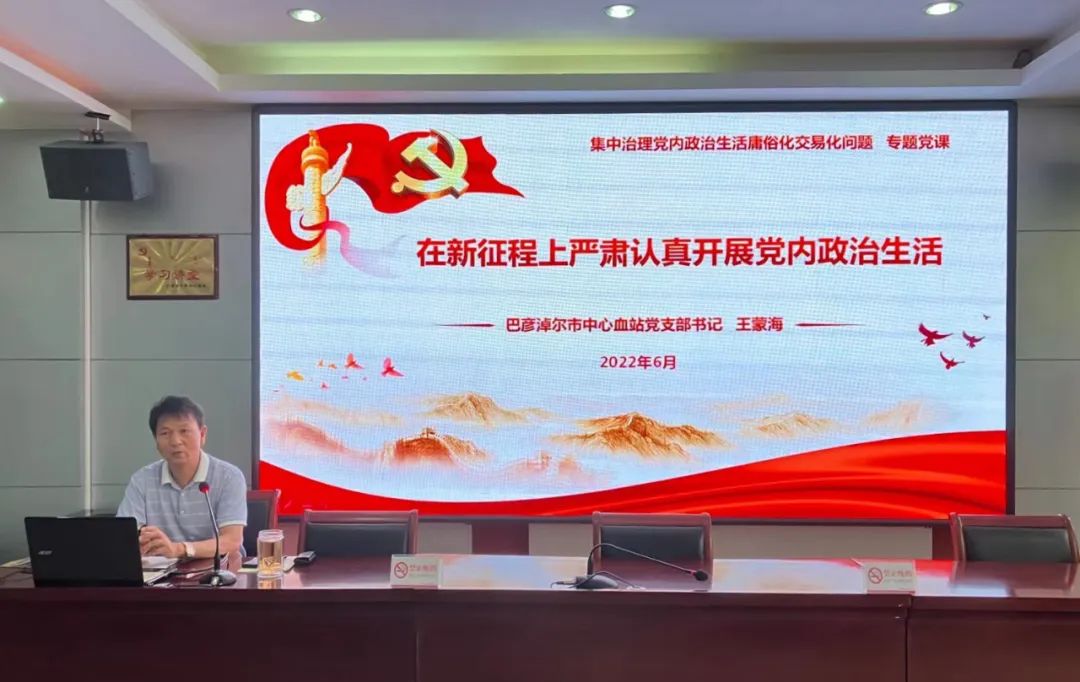 6月27日下午,内蒙古巴彦淖尔市中心血站党支部开展了以“在新征程上严肃认真开展党内政治生活”为主题的集中治理党内政治生活庸俗化交易化问题专题党课,全站党员、入党积极分子等30多人参加了此次学习。