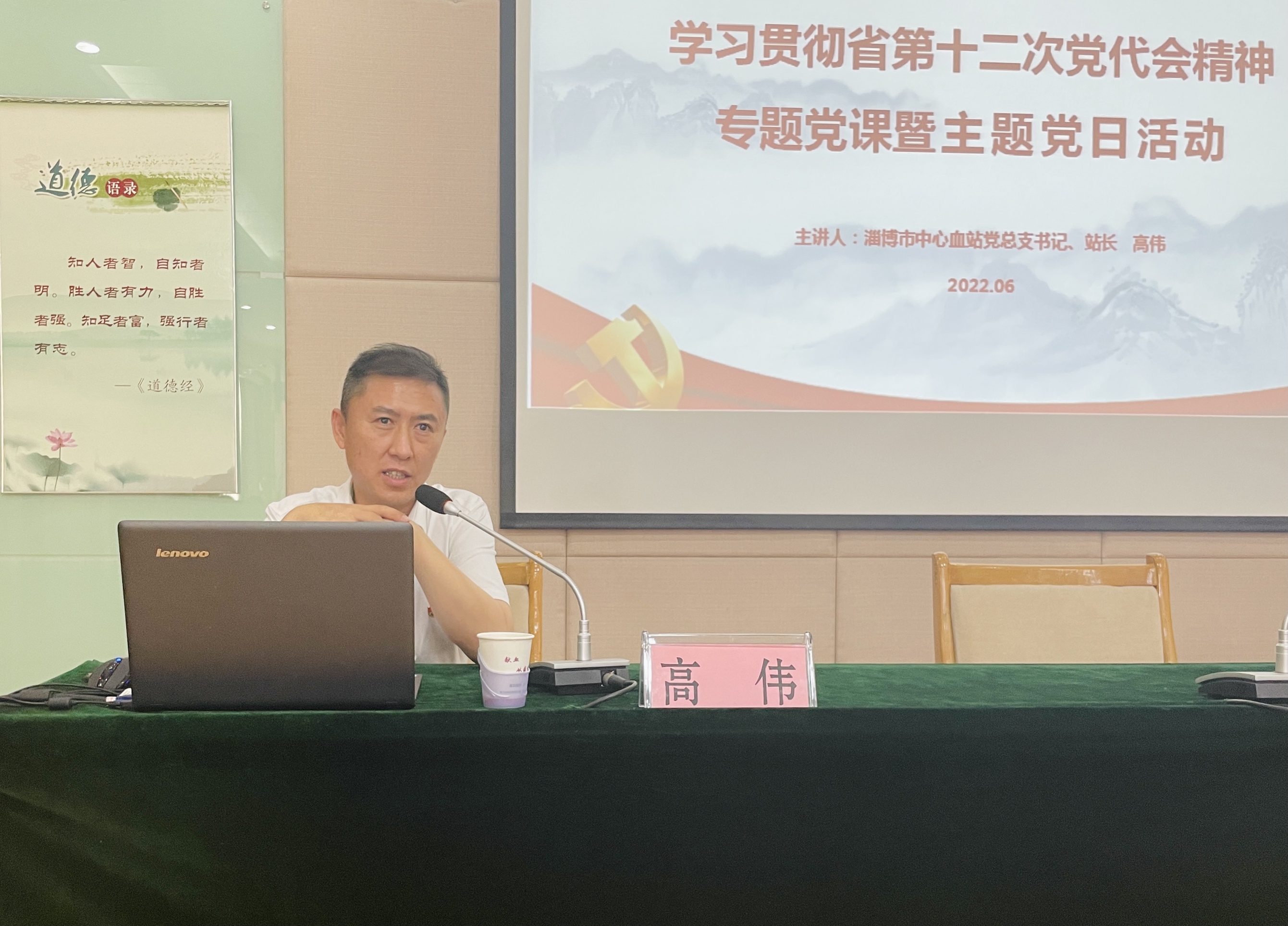 6月28日上午,淄博市中心血站召开庆“七一”表彰大会暨学习贯彻省十二次党代会精神专题党课。大会由站党总支委员、副站长姚建主持,全体党员和中层干部50余人参加。