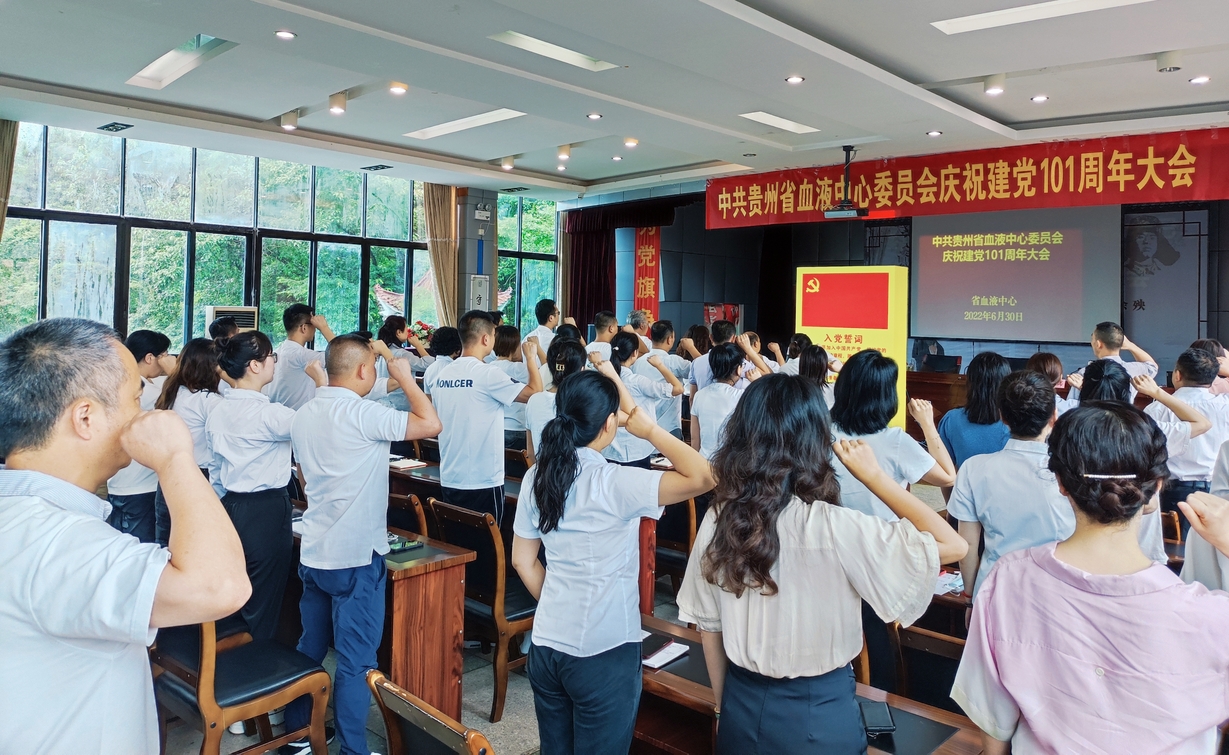 为热烈庆祝中国共产党成立101周年,回顾党的光辉历程,颂扬党的丰功伟绩,唱响新时代主旋律,进一步激发中心党员干部职工在新时代新担当新作为,2022年6月30日,省血液中心党委召开庆祝建党101周年大会。中心领导班子成员,各科室科级干部,全体在岗党员,各党支部党员发展对象、入党积极分子、入党申请人参加会议。