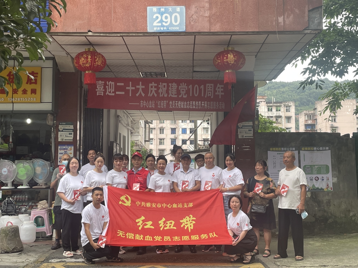 6月30日,雅安市中心血站党支部“红纽带”无偿献血党员志愿服务队赴桐梓林社区斑鸠井大院开展以“迎七一 • 强党性 理论宣讲进社区”为主题的党员志愿活动。