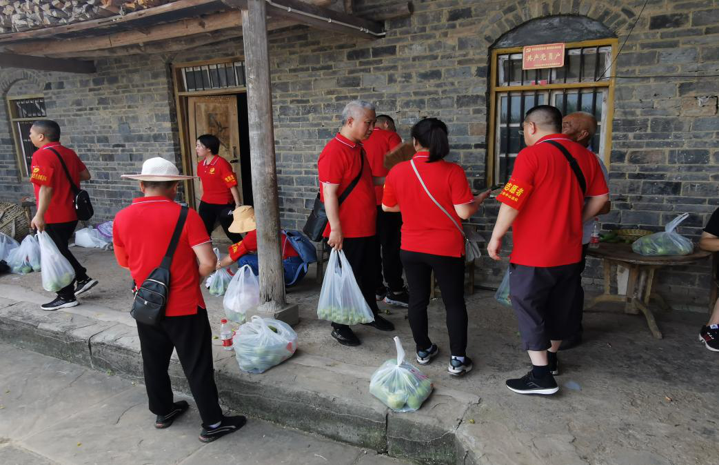 虽有烈日当头,党员同志依旧不怕苦,不怕累,帮助龙井村村民采摘脆李143斤、翠冠梨276斤,以购代扶购买农产品1200余元。