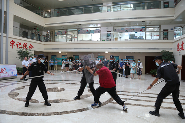 演练现场,一名“恐怖分子”男子携带管制器材进入血站办公大楼,驻足大厅,值守安保人员上前向其征询。过程中该男子与保安人员发生争执,立即抽出武器威胁现场其他工作人员。突发事件发生后,当即启动反恐应急处置预案和紧急联动机制,其他安保人员携带防爆盾牌、抓捕叉、防爆棍等快速赶赴现场,在及时疏散现场群众后,立即对现场实施外围警戒,抓住时机协同配合,成功将“恐怖分子”制服,同时,现场工作人员进行报警处理。