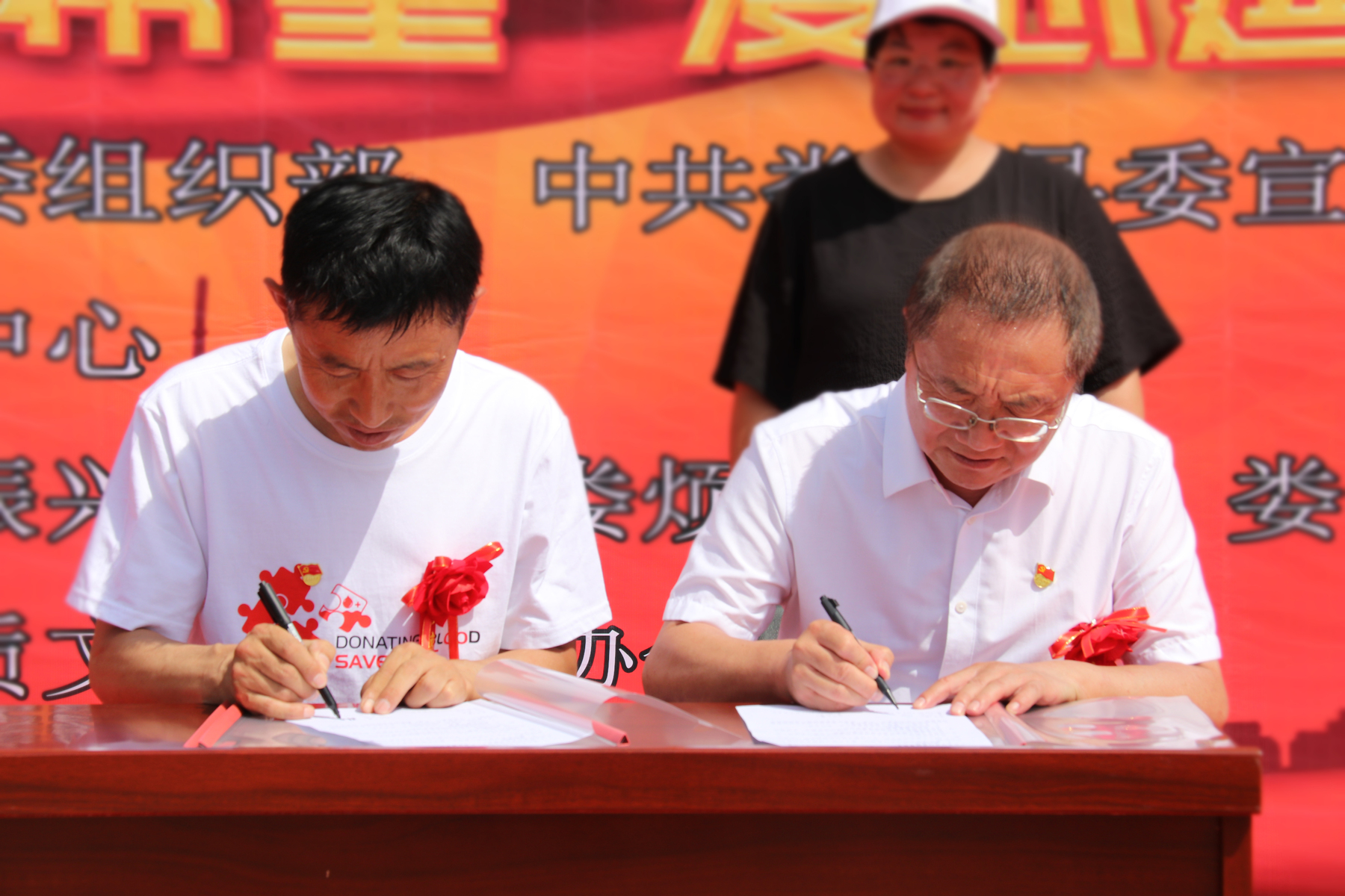 太原市血液中心党委书记、主任白林和罗家曲村党支部书记、村委会主任、村集体经济合作社理事长冯玉军签定购销合同。