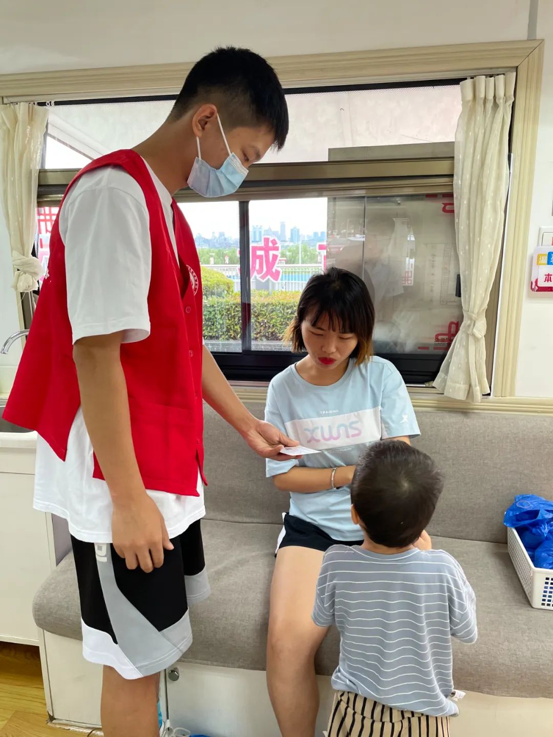 七月的盛夏,烈日毫不留情的烤着大地上的一切。每年寒暑假,都是采供血的淡季,这时每一位献血者和志愿者都是抗着酷暑的热血英雄。喻可欣是初二的一名学生,一放暑假,在安排好自己的学习之余,她主动要求姐姐带她来做志愿者。而她的姐姐正是秋水广场献血点的一名采血护士—高珊。在工作中高珊认真负责,生活中也经常会和家人、朋友宣传无偿献血的知识。别看妹妹年纪小,做起事情来一点也不含糊。在高珊姐姐的指导下认真的为献血者发鞋套、倒水等。在读大三的哥哥喻祥辉也放暑假了,每天和高珊一起上下班,兄妹俩一起做志愿服务,只要有什么力气活,哥哥也总是冲在最前面,帮忙做志愿服务的同时也成为了我们的贴心小助手。当南昌的气温直达38度高温的时候,喻可欣和喻祥辉的妈妈作为一名资深献血者,深知夏季采血不易,就来到秋水广场第一个奉献了一袋热血。