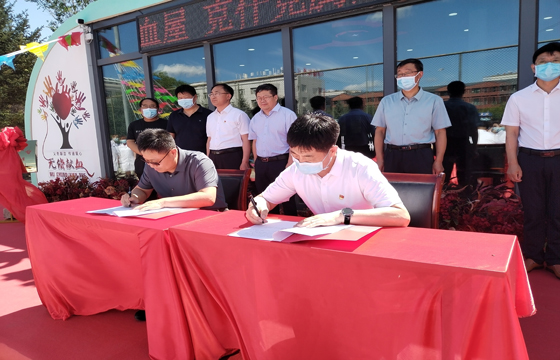 赤峰市中心血站党支部书记、站长王鹏坤和克旗人民医院党委副书记院长邹尚军进行市、县融合血液采集签约仪式。