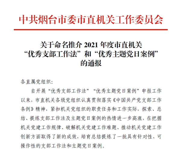 近日,中共烟台市委市直机关工作委员会公布了《关于命名推介2021 年度市直机关“优秀支部工作法”和“优秀主题党日案例”的通报》,市中心血站第二党支部“一体化”支部工作法获得2021年度市直机关“优秀工作法”荣誉称号。