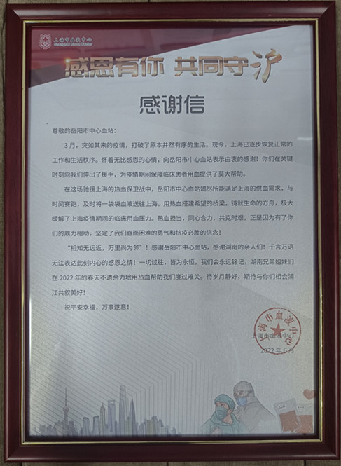 近日,上海市血液中心向岳阳市中心血站发来专题感谢信。信中向岳阳市中心血站在上海抗击疫情关键时刻伸出援手,支援血液8万毫升,为确保疫情期间上海临床用血持续供应和保障病患生命安全表示崇高的敬意和由衷的感谢!