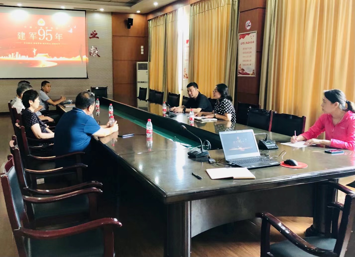 为庆祝中国人民解放军建军95周年,7月29日,淄博市中心血站组织召开退役军人“八一”座谈会。站党总支委员、专职副书记伦华美主持会议,站领导班子成员、血站退役军人代表参加座谈。