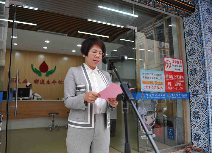 图为右江区卫生健康局局长张云舞在启动仪式上讲话并宣布献血活动启动