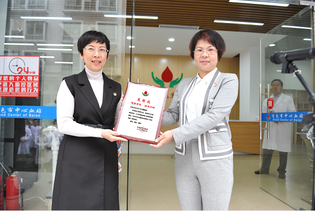图为市中心血站党支部书记、站长梁朦尹为百色市无偿献血事业做出突出贡献的右江区卫生健康局颁发感谢状