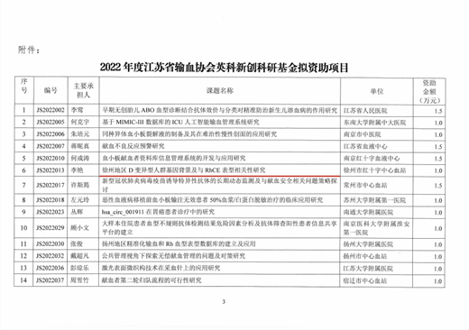 日前,徐州市血液中心申报的《徐州地区D 变异型人群基因背景及与RhCE表型相关性研究》获江苏省输血协会英科新创科研基金立项资助。该基金于2018年设立,旨在调动医疗和采供血机构从事输血医学和管理工作者积极性,促进全省输血医学和输血服务水平提高。我中心已连续3次获得该基金资助。