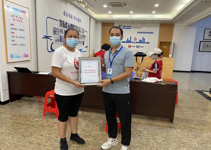 根据《南宁市献血条例》《南宁市无偿献血奖励办法》等相关规定,我市对2020-2021年度在无偿献血工作中作出突出成绩单位团体和个人进行奖励,其中29家单位荣获“无偿献血促进奖单位奖”,13人荣获“无偿献血促进奖个人奖”,42人荣获“无偿献血终身成就奖”,6206人荣获“无偿献血之星”,128人荣获“无偿献血志愿服务奖”,无偿献血是一项社会公益事业,我市无偿献血事业的发展离不开每一位无偿献血者和志愿者的热心参与。南宁中心血站将会一如既往地为献血者和用血患者提供优质的服务,同时希望更多符合献血条件的爱心人士不断加入到无偿献血这项公益事业中来。