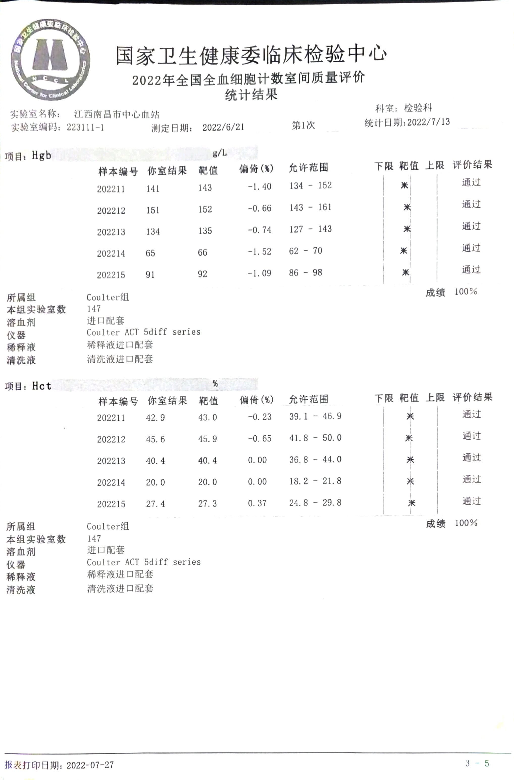 近日,国家卫健委临检中心公布了2022年《全国临床检验室间质量评价报告》,南昌市中心血站检验实验室满分通过本次室间质评。据悉,血站已是连续七年参加全国血站全血细胞计数室间质量评价获得满分成绩。