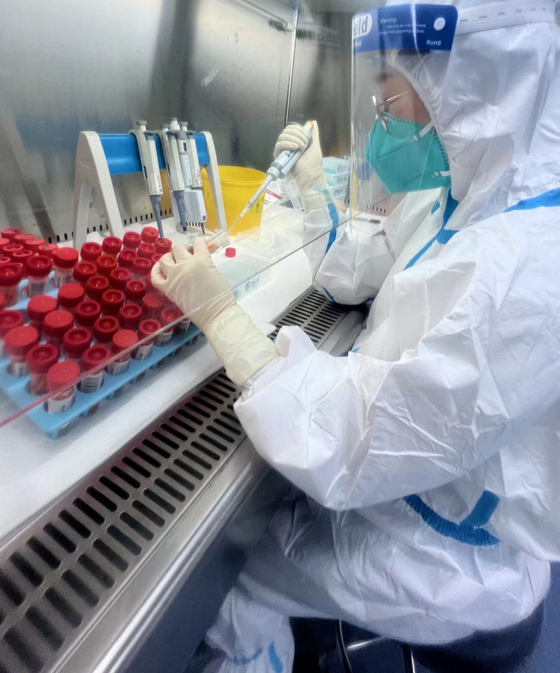 在一份份核酸检测报告的背后,有这样一群人,他们身穿白色防护服,头戴防护面屏、N95口罩,连朝接夕,与时间赛跑,他们是行走在刀尖上的防疫尖兵,是全民抗“疫”背后鲜为人知的“幕后英雄”——核酸检测实验室的检测人员。