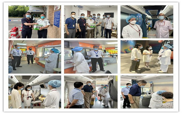 中心党政领导邹峥嵘、何智纯、陈强、张晰、朱自严分别带队,走访冒着炎热酷暑仍坚守在豫园点、上海站南广场、上海站北广场、北上海献血点、大场献血点、莘庄点、上海南站点、人民公园点、六百点等九个流动车献血点和中心本部后勤服务部物业科、安保科、车管科、保洁等户外一线工作人员,为他们送上防暑降温物品。在现场,中心党政领导每到一处都与一线职工亲切交谈,详细了解高温天气下的工作情况和高温防护、疫情防控措施等情况,对他们冒着高温酷暑,一如既往地坚守在工作岗位,用勤劳和付出,为确保本市临床血液供应积极贡献表示感谢,并嘱咐他们正值酷暑时期,要提高防暑降温意识,在认真工作的同时,也要做好自我防护,落实好疫情防控措施,尤其要重视特殊天气环境下的用电安全、食品安全,做好日常巡察,确保各项重点环节的安全防范不放松。同时,叮嘱一线职工要注重劳逸结合,科学合理安排露天作业时间,保证以最佳的状态投入到工作中。